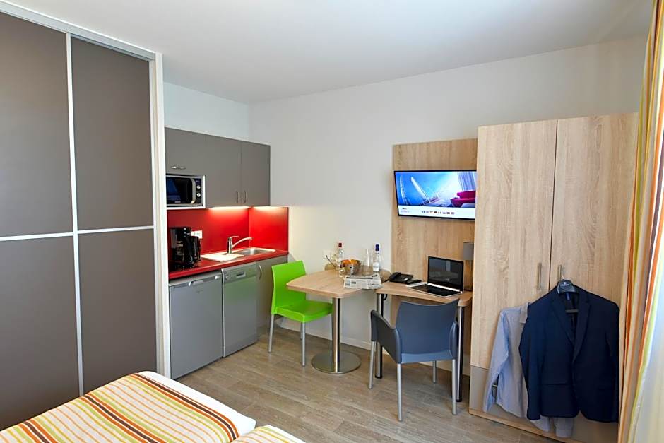 This studio features a dishwasher, kitchenware and toaster.